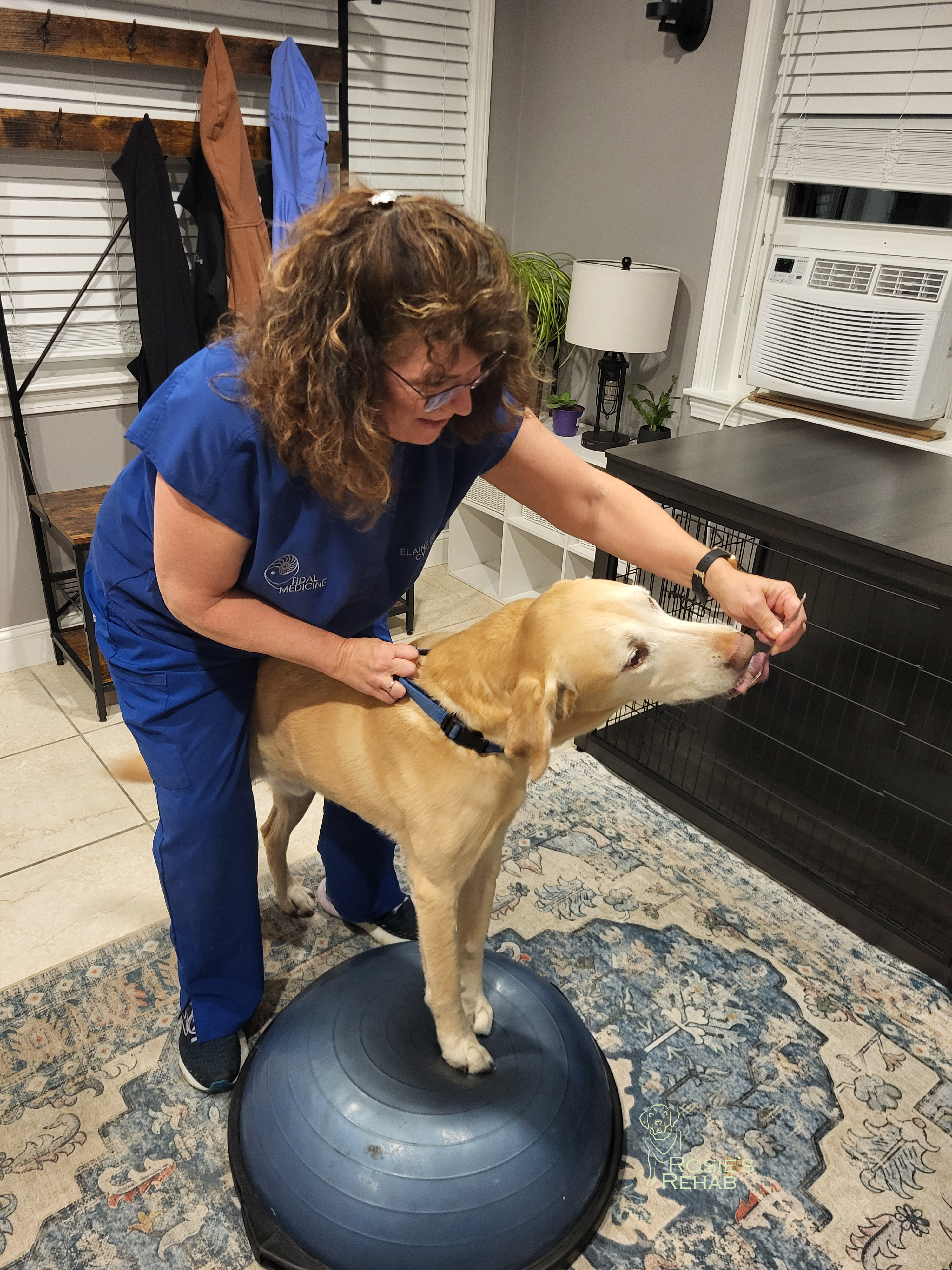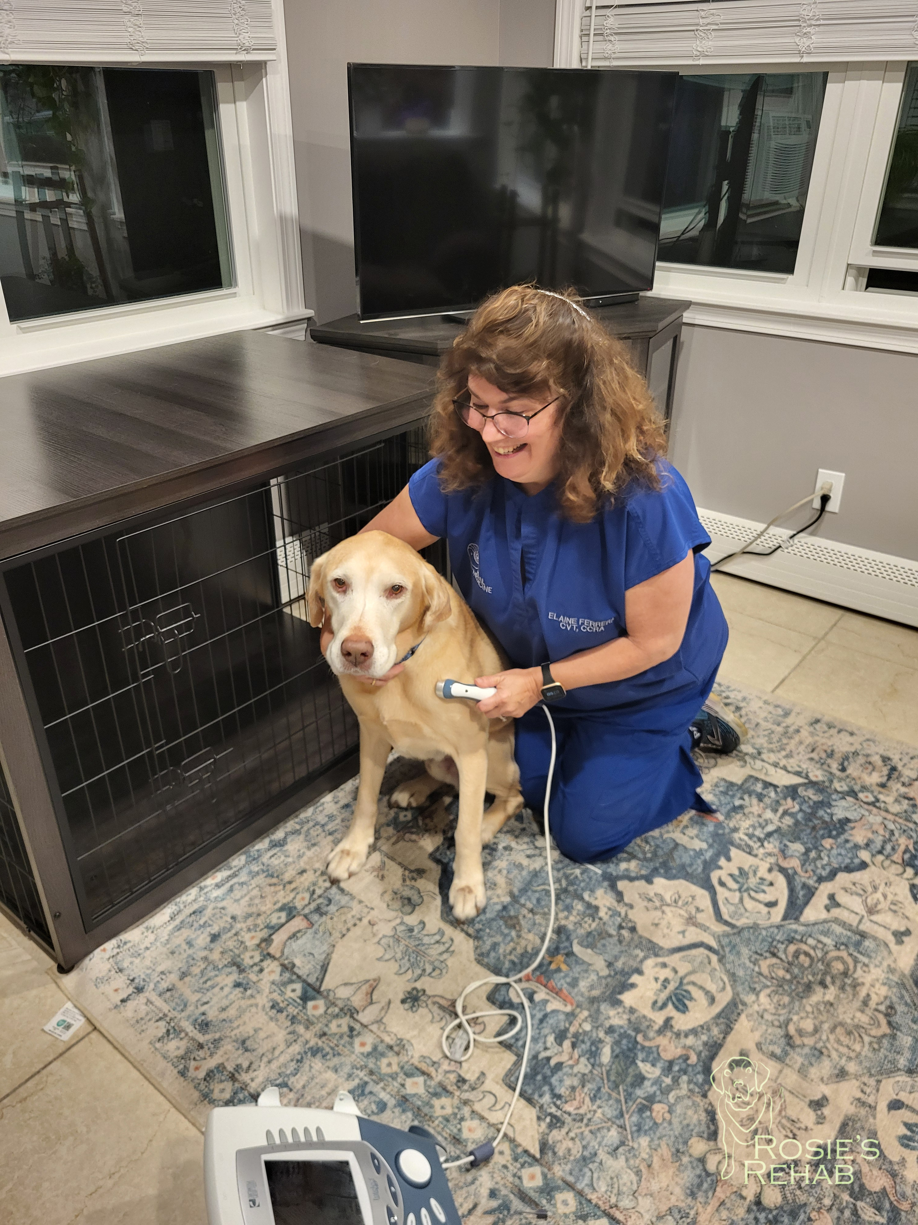 Elaine Ferrera is a Certified Veterinary Technician who has a specialty in Veterinary Rehabilitation with over 30 years experience in the field! Elaine graduated from Mount Ida College and became a CVT in May of 1991. She then completed the Certified Canine Rehabilitation Veterinary Technician program at the Canine Rehabilitation Institute in Coral Springs Florida in May of 2015. Elaine worked at Massachusetts Veterinary Referral Hospital for over 20 years in several departments including Emergency Critical Care, Internal medicine, Surgery and Canine Rehabilitation. As of 2021 Elaine has been working in the Cape Ann area bringing Canine Rehab to pets in their owners homes. Elaine brings a tremendous amount of passion and enthusiasm to her work! Elaine is thrilled to announce she will be offering her services full time and beyond Cape Ann. Rosie’s Rehab offers in-home Veterinary Physiotherapy, laser therapy and therapeutic ultrasound. With direct Veterinary referrals Elaine will now be able to treat and help many more pets!